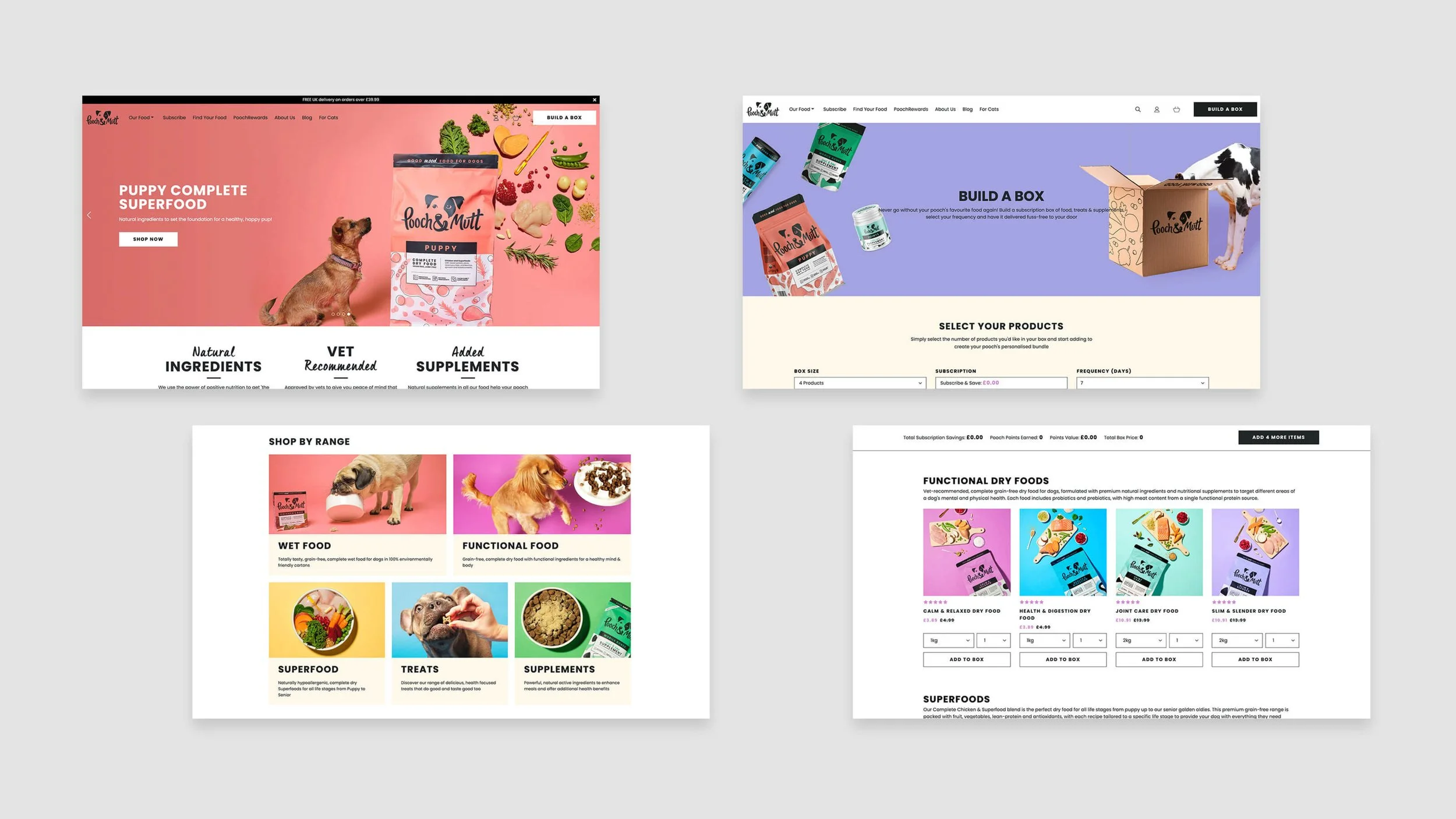 Pooch & Mutt had rapid growth, but the brand was aware of a few on-site issues that they wanted to tidy up and the turnaround was fast. First up, the user experience (UX) was not as intuitive as it could be, with page structure proving confusing, and individual products set up as variants. The ecosystem needed to be pulled apart, then pieced back together again, so that shoppers could find the right food for their pups with ease.